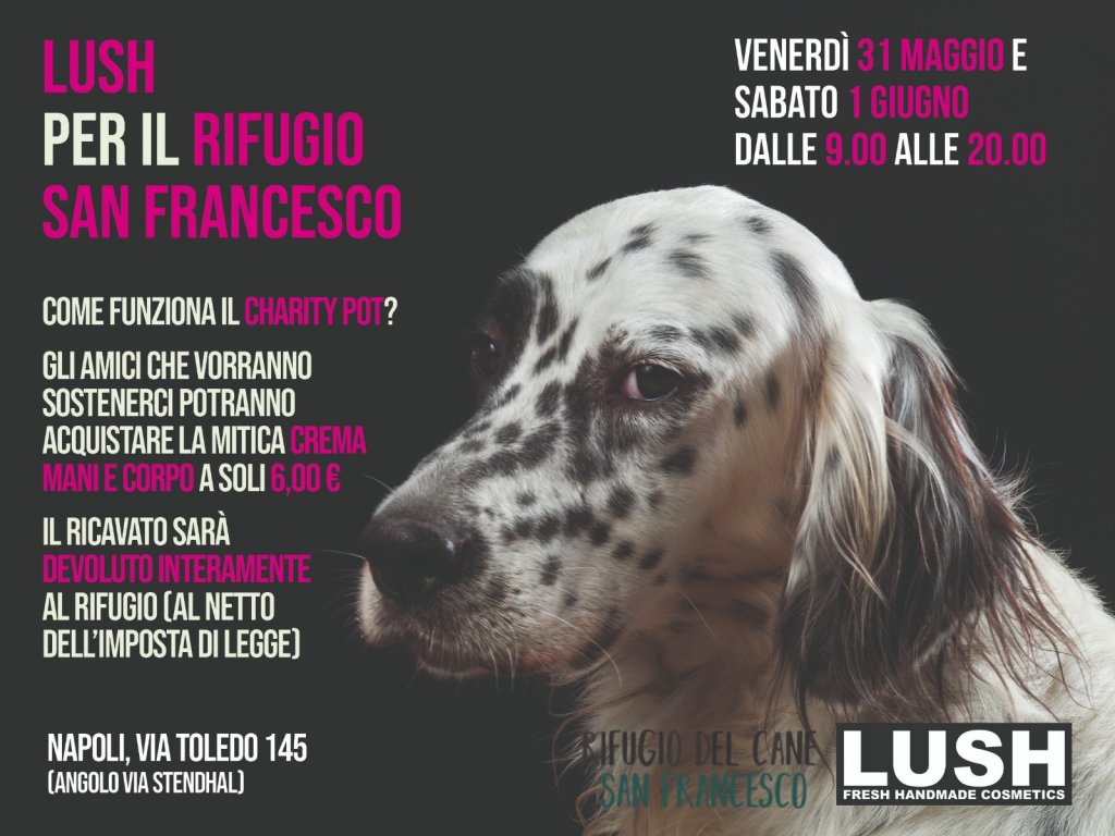 In questa profumatissima location noi volontari saremo ospitati per incontrare Voi amici, che se vorrete potrete acquistare la mitica crema mani e corpo della Lush, la "Charity Pot" a soli 6 euro. Il ricavato della vendita del prodotto sarà devoluto al Rifugio san Francesco, al netto dell'imposta di legge.